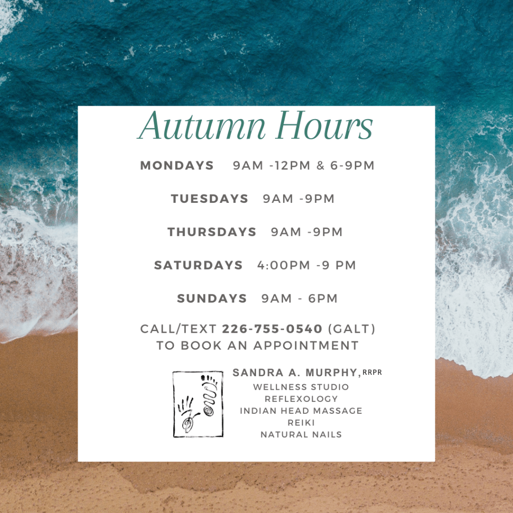 Also a great time to prep our skin for cold weather. I know my feet and hands take a beating from the gardening, walking beaches. Over the summer I have been making up some lotions and potions to help keep the feet, hands, and body in tip top shape! I have little samplers and some bigger small batch mixtures that you can purchase after your treatment. Only in person sales for now though.