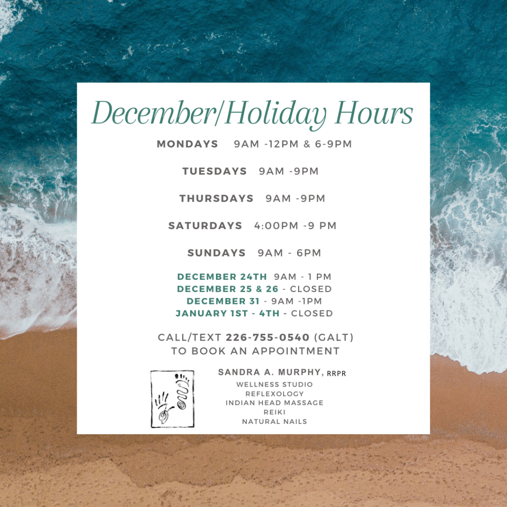 The new December Promos (check out the ‘Promos’ section) are out and spots are filling fast! To help you book your appointment, here are the December & Holiday Hours.