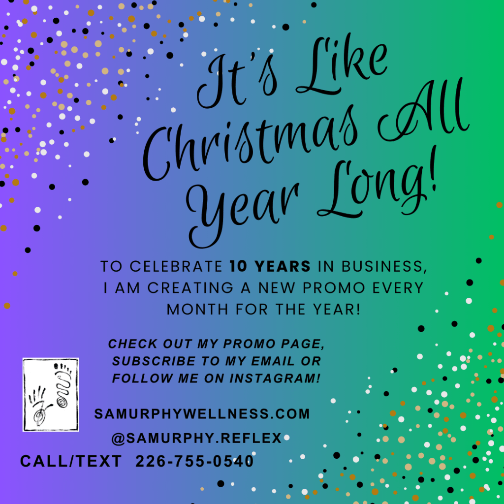 I can’t believe it has been 10 years that I started my small business! For many years, I worked full time in the hotel industry and did reflexology in any free time I had left, getting my name out there and slowly building up my clientele. I have learned much over the years and have also helped out many clients with their wellness goals. I continue to learn and seek out new ideas and techniques in order to be flexible with client needs and goals.