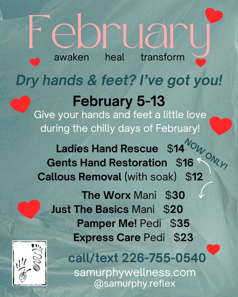 Get a little ‘me time’ in for those hardworking feet and hands! Lots of deals in February, pick one, two, or three treatments. Your hands and feet will thank you!