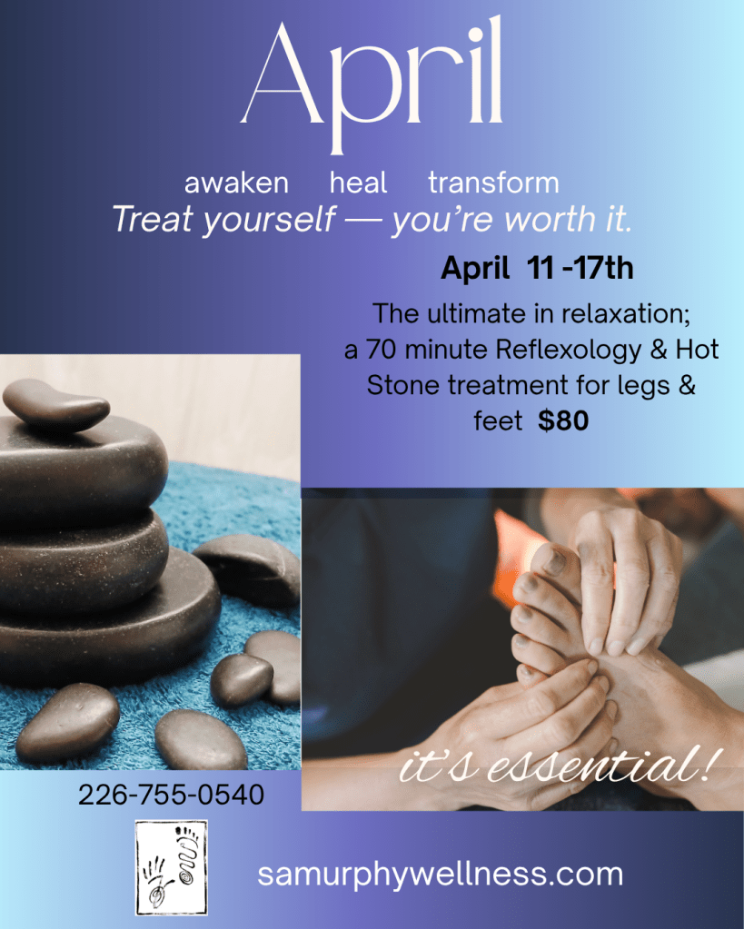 This one you won’t want to miss! While your first foot is getting a relaxing Reflexology treatment, your other foot will be soothed in the warmth of heated stones while waiting its turn. Once the treatment is done, the leg/foot massage will be done with more warmed stones to relieve any other tension or issues your feet may be holding. Pure bliss!